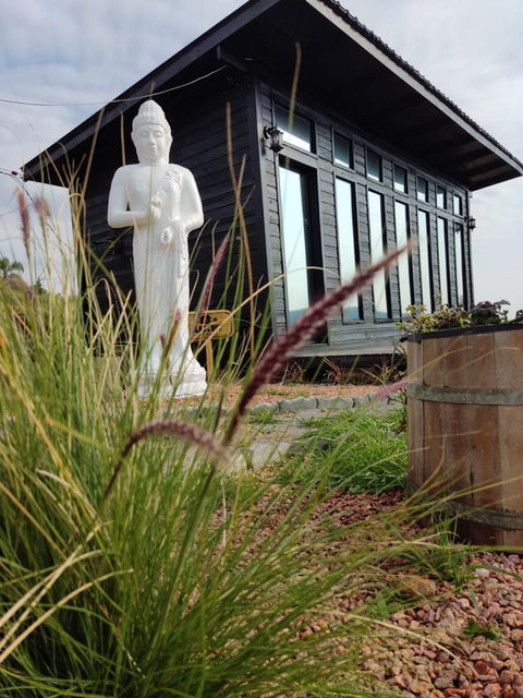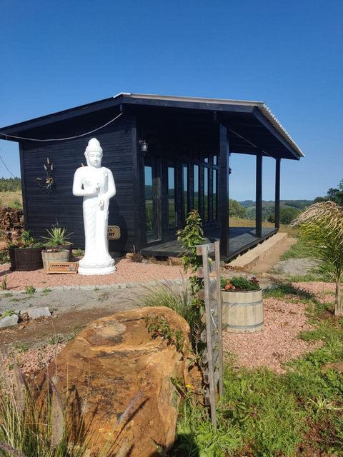 Estátua de Buda de 2,5 metros na entrada, simbolizando paz e serenidade.